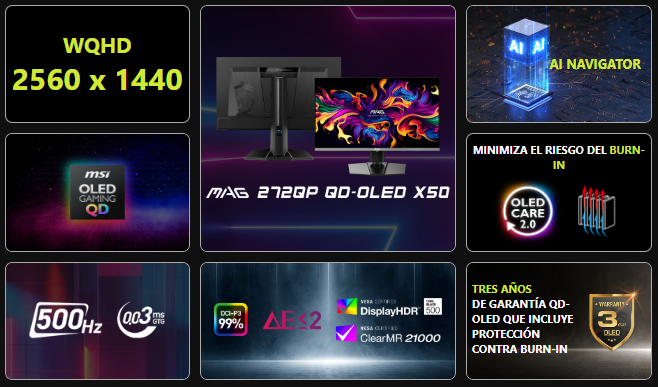 El MAG 272QP QD-OLED X50 lleva el gaming competitivo a otro nivel con su panel QD-OLED de 3ª generación, una tasa de refresco de 500Hz y un tiempo de respuesta de 0.03ms (GtG). Certificado VESA DisplayHDR True Black 500 y ClearMR 21000, con cobertura de color del 99% DCI-P3 y precisión ΔE≤2.